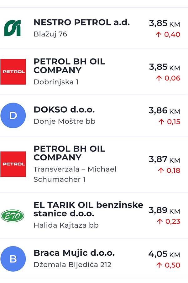 Prema podacima sa benzinskih stanica u Sarajevu, najniže zabilježene cijene dizela kreću se oko 3,79 KM, dok su na pojedinim lokacijama, posebno na frekventnijim saobraćajnicama, cijene prešle granicu od četiri marke po litru.