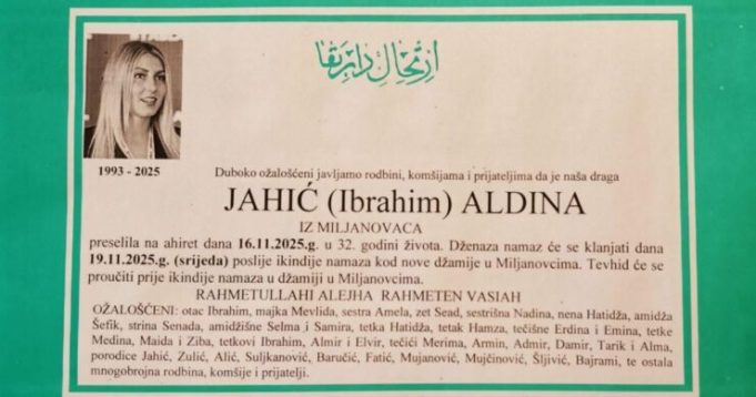 Dženaza namaz Aldini Jahić će se klanjati danas poslije ikindije namaza kod nove džamije u Miljanovcima