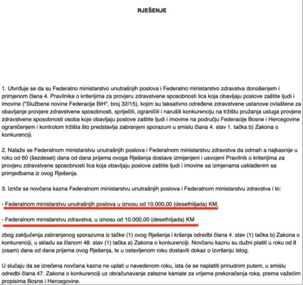 Kako stoji u rješenju Konkurencijskog vijeća, oba ministarstva su ograničila i narušila konkurenciju na tržištu pružanja zdravstvenih usluga. Oba ministarstva su, ističe se, sklopila zabranjene sporazume po Zakonu o konkurenciji BiH.