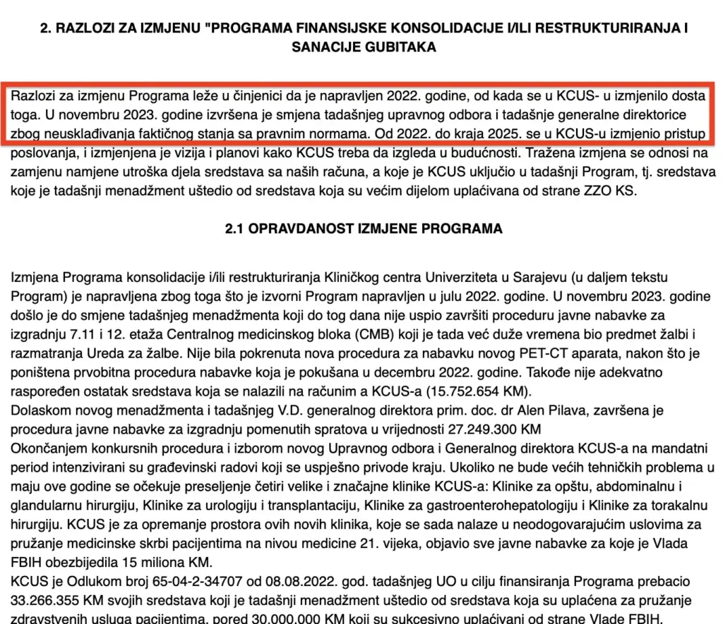 Nije bila pokrenuta nova procedura za nabavku novog PET-CT aparata, nakon što je poništena prvobitna procedura nabavke koja je pokušana u decembru 2022. godine. Takođe nije adekvatno raspoređen ostatak sredstava koja se nalazili na računim a KCUS-a (15.752.654 KM)”, ističe se u aktu kojeg potpisuje predsjednik Upravnog odbora KCUS-a Benjamin Kulovac.