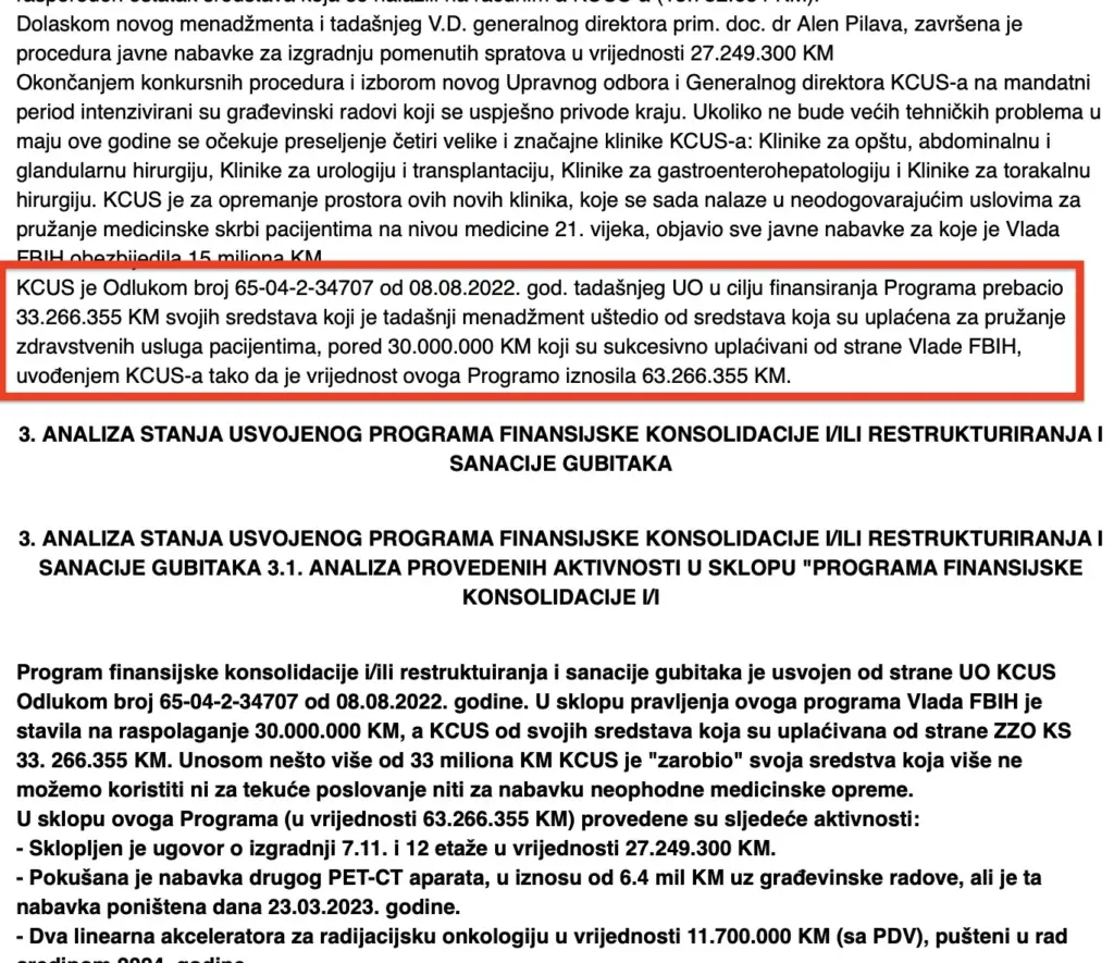 Dalje navodi da je Vlada FBiH, u sklopu pravljenja programa usvojenog 2022. godine, stavila na raspolaganje 30.000.000 KM, a KCUS od svojih sredstava koja su uplaćivana od strane ZZO KS 33.266.355 KM.