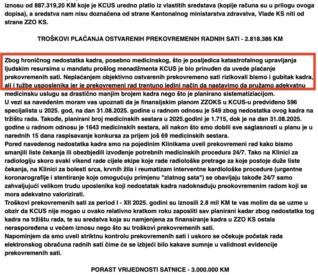 Kaže da su troškovi prekovremenih sati za period cijele 2025. godini znosili 2,8 mil KM tuz opasku da niko nije mogao u ovako relativno kratkom roku zaposliti sav planirani kadar. Dodaje da su zbog nedostatka tog kadra na tržištu rada, sredstva koja su namjenjena za finansiranje kadra u ZZO KS ostala neraspoređena u većem iznosu nego što su troškovi prekovremenih sati.