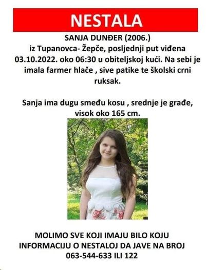 Naime, kako se navodi 16-godišnja Sanja iz Tupanovaca, kod Žepča, posljednji put viđena je 3. oktobra oko 06:30 sati u porodičnoj kući.