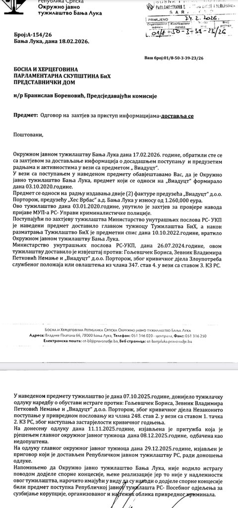 Branislav Borenović, poslanik PDP-a u Predstavničkom domu PSBiH i predsjednik parlamentarne Komisije za borbu protiv korupcije, objavio je šokantne informacije o obustavljanju istrage u slučaju “Viaduct”.