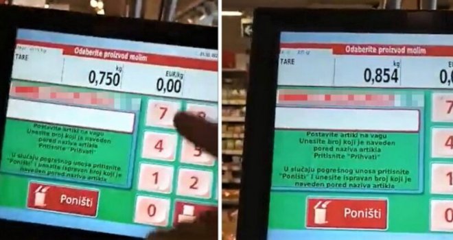 Kupac snima kako vaga luk koji je prethodno stavio u kesu. Vaga mu pokazuje težinu od 854 grama. Potom kupac miče zaštitnu plastiku s vage i opet stavlja luk na nju. Vaga pokazuje 750 grama, dakle 100-tinjak grama manje.