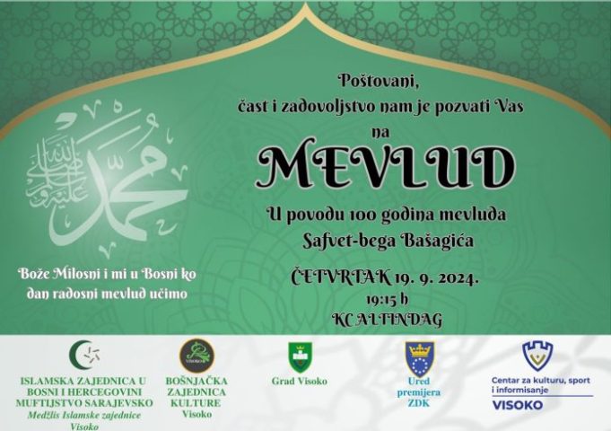 Medžlis IZ Visoko, Bošnjačka zajednica kulture “Preporod” Gradsko društvo Visoko i JU Centar za kulturu i informisanje Visoko povodom 12. rebiul-evvela, dana rođenja posljednjeg Božijeg Poslanika Muhammeda, a.s, 100 godina od objavljivanja Mevluda Safvet-bega Bašagića i 100 godina od osnivanja Narodne uzdanice (koja je sa Gajretom bila predhodnk današnjeg “Preporoda”) organizuju Mevlud u KC Altindag u četvrtak 19. septembra u 19:15 sati.