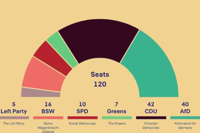 Na drugom mjestu našla se Kršćansko-demokratska unija (CDU) sa 23,8 posto podrške, osiguravši 23 mjesta u parlamentu. Ekstremno lijevi BSW osvojio je 15 mjesta, dok je ljevičarska stranka Die Linke dobila 12 mandata. Socijaldemokratska partija Njemačke (SPD) je posljednja stranka koja će ući u parlament, s osvojenih šest mjesta.