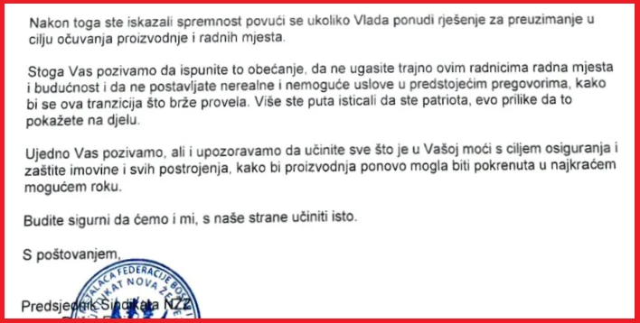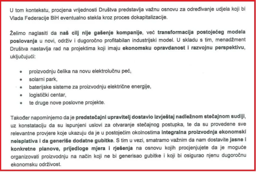 „Na našem sastanku održanom 21.04.2026. godine s Vama i Gordanom Pavlovićem, jasno ste kazali da ponovno pokretanje Visoke peći za vas više nije opcija, bez obzira na eventualne mjere zaštite domaće proizvodnje, za šta smo se svim srcem borili u proteklim mjesecima radi očuvanja radnih mjesta. Takav Vaš stav je za nas apsolutno neprihvatljiv i to smo vrlo jasno kazali na pomenutom sastanku“, poručio je Fetić direktoru i suvlasniku Nove Željezare Ahmedu Hamziću.