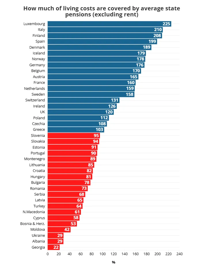 S druge strane, u velikom broju država penzije ne dostižu nivo osnovnih troškova. U pojedinim slučajevima pokrivaju više od 80 posto, kao u Sloveniji sa 95 posto, Hrvatskoj sa 82 posto i Crnoj Gori sa 89 posto, ali u mnogim zemljama taj udio je znatno niži. Na donjem dijelu ljestvice nalaze se Gruzija sa 22 posto, Albanija i Ukrajina sa po 29 posto, te Moldavija sa 42 posto, gdje penzije ne pokrivaju ni polovinu troškova života.