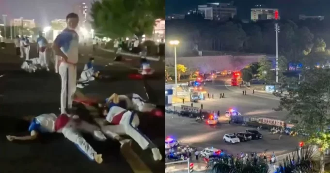 Policija Zhuhaija saopćila da je osumnjičeni, 62-godišnji muškarac prezimenom Fan, na liječenju u bolnici nakon što se ranio nožem u svom automobilu. Na snimcima koji su se pojavili na internetu može se vidjeti kako radnici sa cisternama i šmrkovima peru krvave ulice.