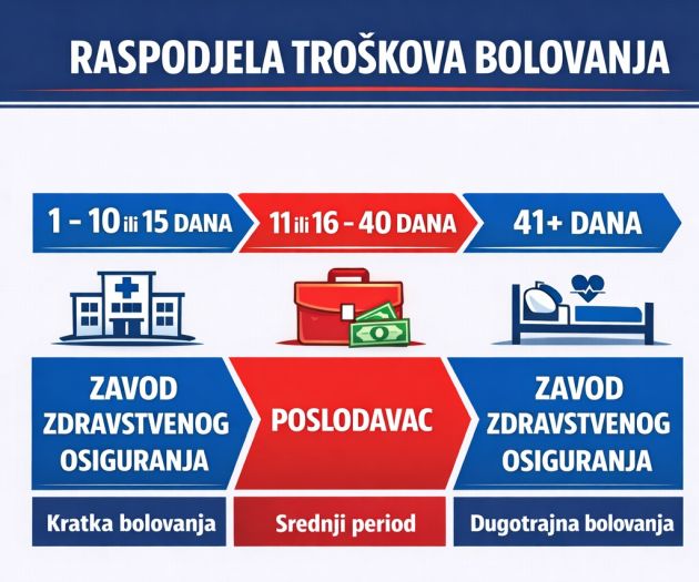 Prema informacijama iz pregovaračkih krugova, dio poslodavaca predlaže model prema kojem bi troškove bolovanja do 10 ili 15 dana snosio Zavod zdravstvenog osiguranja, zatim bi period od 10 ili 15 do 40 dana bio na teret poslodavaca, dok bi za bolovanja duža od 40 dana obavezu ponovo preuzeo Zavod.