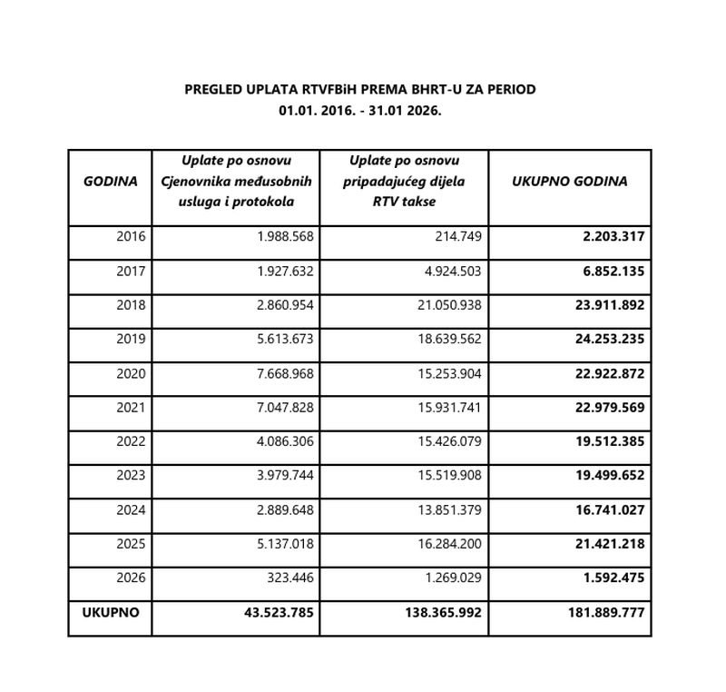 Naime, radi su o notornoj neistini jer RTVFBiH ni po kojem osnovu nema dugovanja prema BHRT-u sukladno Zakonu o javnom RTV sistemu BiH. Nasuprot neistinitoj tvrdnji pojedinih članova rukovodstva BHRT-a, dužni smo obavijestiti bosanskohercegovačku javnost da je u periodu od 01.01.2016. do 31.01.2026. godine na osnovu zakonom ustanovljenog Cjenovnika međusobnih usluga i Protokola, Radio-televizija Federacije BiH BHRT-u uplatila 43 523 785 KM.