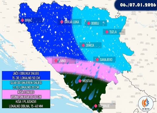 Na jugozapadu Bosne i u sjevernim dijelovima Hercegovine padavine će u početku biti u obliku kiše, ali se u večernjim satima očekuje prelazak u susnježicu i snijeg, uz formiranje ili povećanje snježnog pokrivača od pet do 15 centimetara. U ostatku Hercegovine padat će kiša, mjestimično i obilnija.