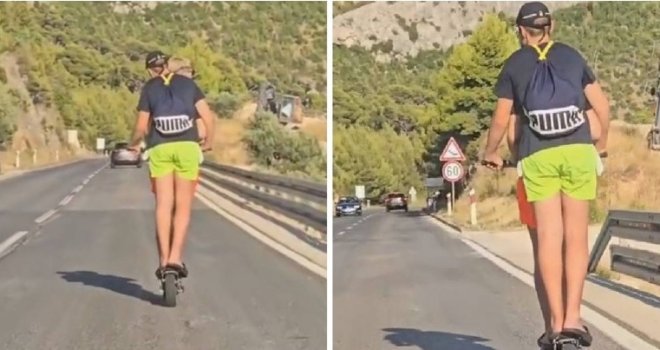 Na magistrali kod Makarske danas su snimljena djeca koja se voze na romobilu.