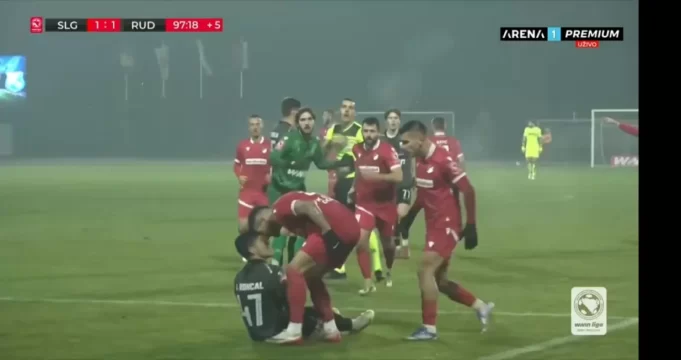 Golman Rudara Vasilije Žunić istrčao je i napravio prekršaj u blizini svog šesnaesterca. Gigović ga je sankcionisao žutim kartonom, a ubrzo su dotrčali i igrači Sloge, pa je krenulo međusobno naguravanje.