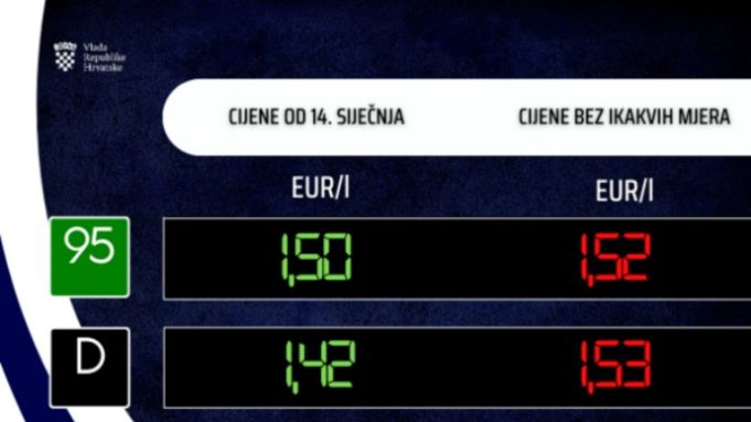 Nove cijene iznosit će 1,50 eura za litru benzinskog goriva ili tri centa više nego sada, 1,42 eura za litru dizelskog goriva, uz povećanje za dva centa, a 0,82 eura za litru plavog dizela, što je također povećanje za tri centa. Istodobno, cijene plina po kilogramu za UNP za spremnike te za UNP za boce od sutra će porasti za po četiri eurocenta, na 1,36 eura odnosno 1,90 eura.