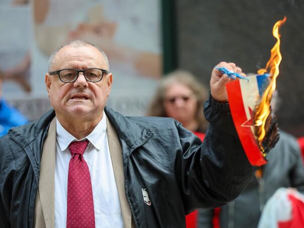 “Pod tim simbolima su ubijani Hrvati u Vukovaru. SDP ne želi da se ovaj simbol zabrani. Ovaj simbol predstavlja totalitarni režim, krvavu petokraku koja je ubijala Hrvate. Ovako ovo završava,” rekao je Keleminec, pa pokušao da zapali zastavu upaljačem. Trebalo mu je nekoliko pokušaja i pomoć jednog od demonstranata koji mu je pridržao zastavu.