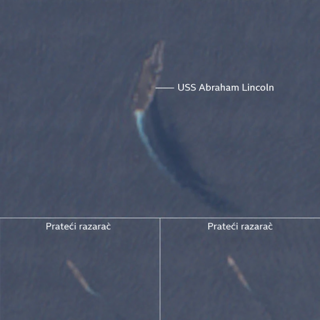 Prema analizi satelitskih snimki koju je proveo BBC Verify, nosač na nuklearni pogon nalazi se na istočnom rubu Omanskog zaljeva, oko 200 kilometara južno od iranske obale. Kako navodi BBC, radi se o najbližoj poziciji tog broda iranskom području od početka rata.