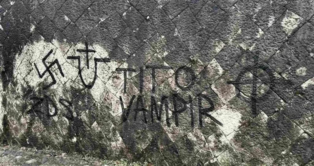 “Tito vampir”, “Praljak nije zločinac”, “Dok komunisti umiru, rađa se sloboda”, ustaška oznaka “U” i zloglasni “ZDS” – samo su neki od uvredljivih i prijetećih natpisa ispisanih po zidovima. Posebnu jezu izaziva spaljena masa nečega što liči na životinjski leš umotan u zastavu. Poruku znaju oni koji su je ostavili. Ovo, nažalost, nije izolovan incident – Partizansko groblje godinama trpi devastacije, skrnavljenja i otvorene provokacije.