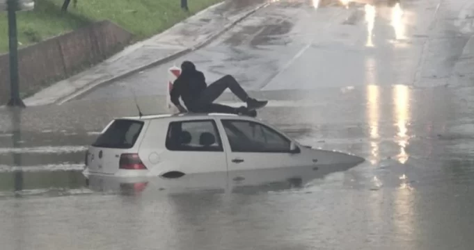 Vozač Golfa pokušao je preći poplavljeni podvožnjak, ali se vozilo zaglavilo u vodi. Kako nije mogao izaći na uobičajen način, spas je pronašao na krovu automobila.
