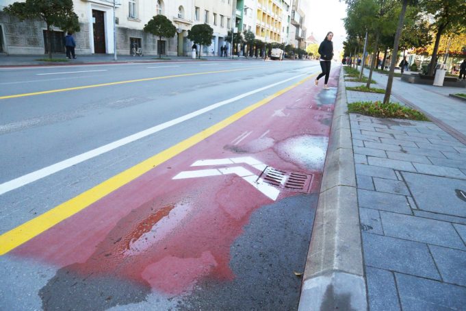 Crvena boja kojom je iscrtana biciklistička staza u pojedinim dijelovima je izbrisana u potpunosti.