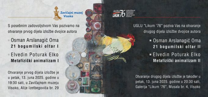U petak, 13. juna ove godine, biće upriličeno otvaranje zajedničke izložbe autora Osmana Arslanagića i Elvedina Poturka, a ono što je zanimljivo jeste činjenica da se izložba sastoji iz dva dijela. Prvi dio izložbe biće svečano otvoren u prostorijama Zavičajnog muzeja s početkom u 19.30 sati, a sat kasnije, u 20.30, drugi dio izložbe će biti otvoren u Galeriji “Likum ‘76”.